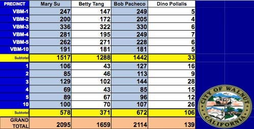Walnut – The Walnut Municipal Election took place on Tues., April 8. The unofficial results show incumbent candidates Bob Pacheco and Mary Su earning the two open seats on the City Council.