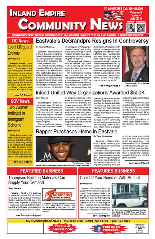 The Inland Empire Community News covers community news for Chino, Chino Hills, Eastvale, Ontario, Corona, Riverside and surrounding areas of the Inland Empire and portions the San Gabriel Valley and northern Orange County. Click this link 2014-07-IEcommnewsAll to access the complete issue in pdf format.