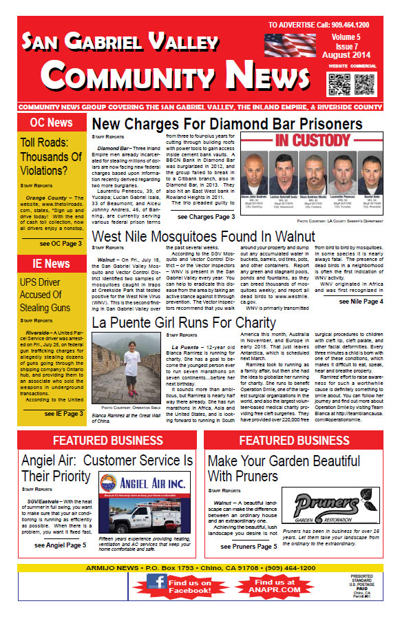 The San Gabriel Valley Community News covers community news for Diamond Bar, Walnut, La Puente, Rowland Heights and surrounding areas of the San Gabriel Valley and portions of the western Inland Empire and northern Orange County. Click this link 2014-08-SGVcommnewsAll to access the complete issue in pdf format.