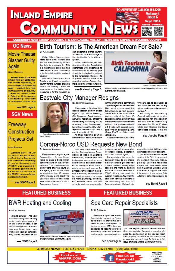 The Inland Empire Community News covers community news for Chino, Chino Hills, Eastvale, Ontario, Corona, Riverside and surrounding areas of the Inland Empire and portions the San Gabriel Valley and northern Orange County. Click this link 2014-09-IEcommnewsAll to access the complete issue in pdf format.