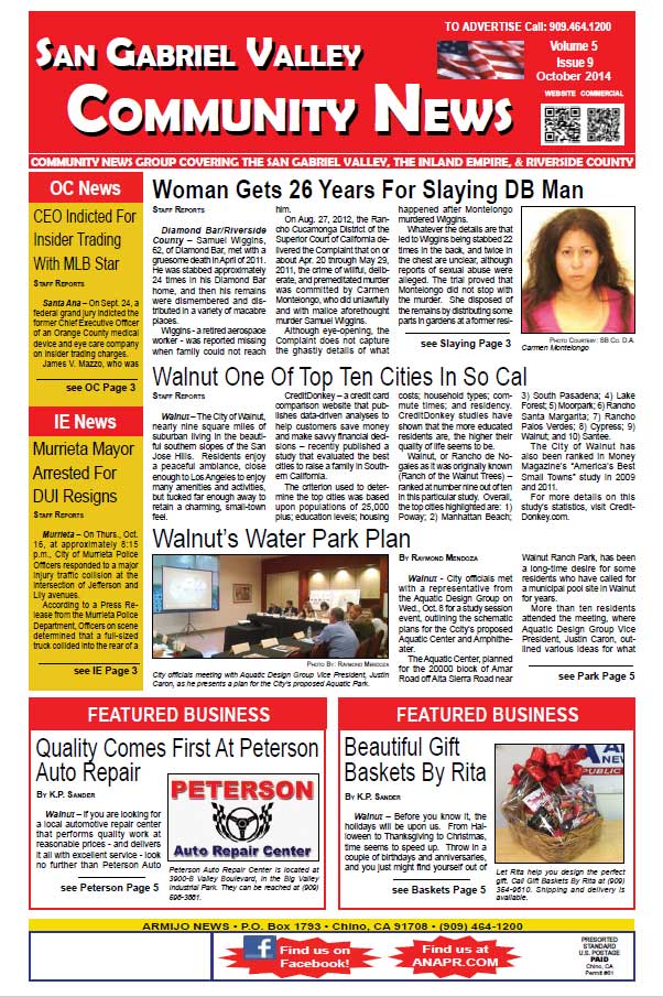 The San Gabriel Valley Community News covers community news for Diamond Bar, Walnut, La Puente, Rowland Heights and surrounding areas of the San Gabriel Valley and portions of the western Inland Empire and northern Orange County. Click this link 2014-10-SGVcommnewsAll to access the complete issue in pdf format.