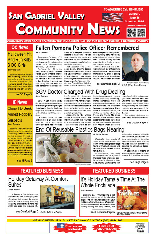 The San Gabriel Valley Community News covers community news for Diamond Bar, Walnut, La Puente, Rowland Heights and surrounding areas of the San Gabriel Valley and portions of the western Inland Empire and northern Orange County. Click this link 2014-11-SGVcommnewsAll to access the complete issue in pdf format.