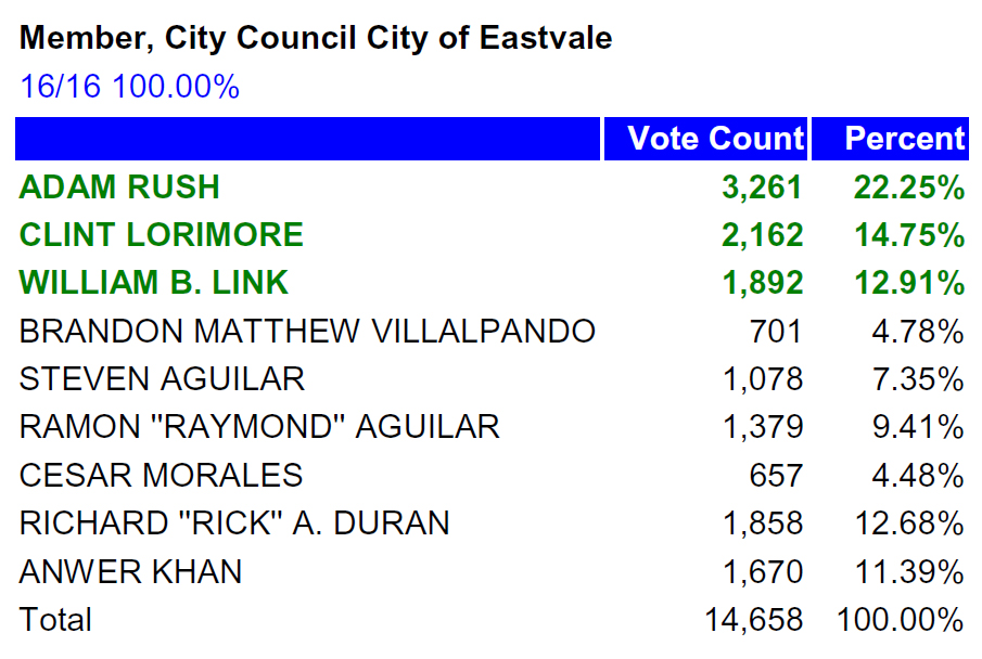 At the recent General Election, three seats on the Council were open. Council members William Link, and Mayor Pro-Tem Adam Rush ran for reelection, while Councilman Ric Welch did not. Nine candidates applied and campaigned for those positions. In the end, Link and Rush were reelected, along with newcomer, Clint Lorimore.