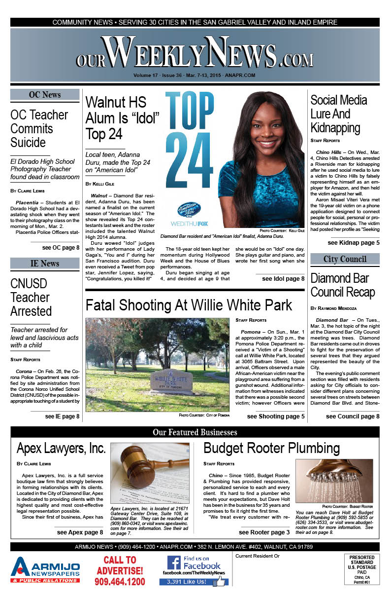 The Weekly News covers community news for Diamond Bar, Walnut, Chino Hills, Rowland Heights and surrounding areas of San Gabriel Valley and the Inland Empire. Click this link 2015-Mar07-Weekly-WEB to access the complete Weekly News for the Mar. 7 issue in PDF format.