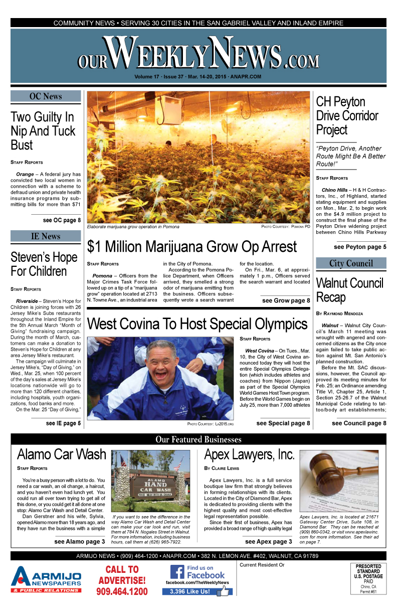The Weekly News covers community news for Diamond Bar, Walnut, Chino Hills, Rowland Heights and surrounding areas of San Gabriel Valley and the Inland Empire. Click this link to access the complete issue in PDF format: 2015-Mar14-Weekly-WEB
