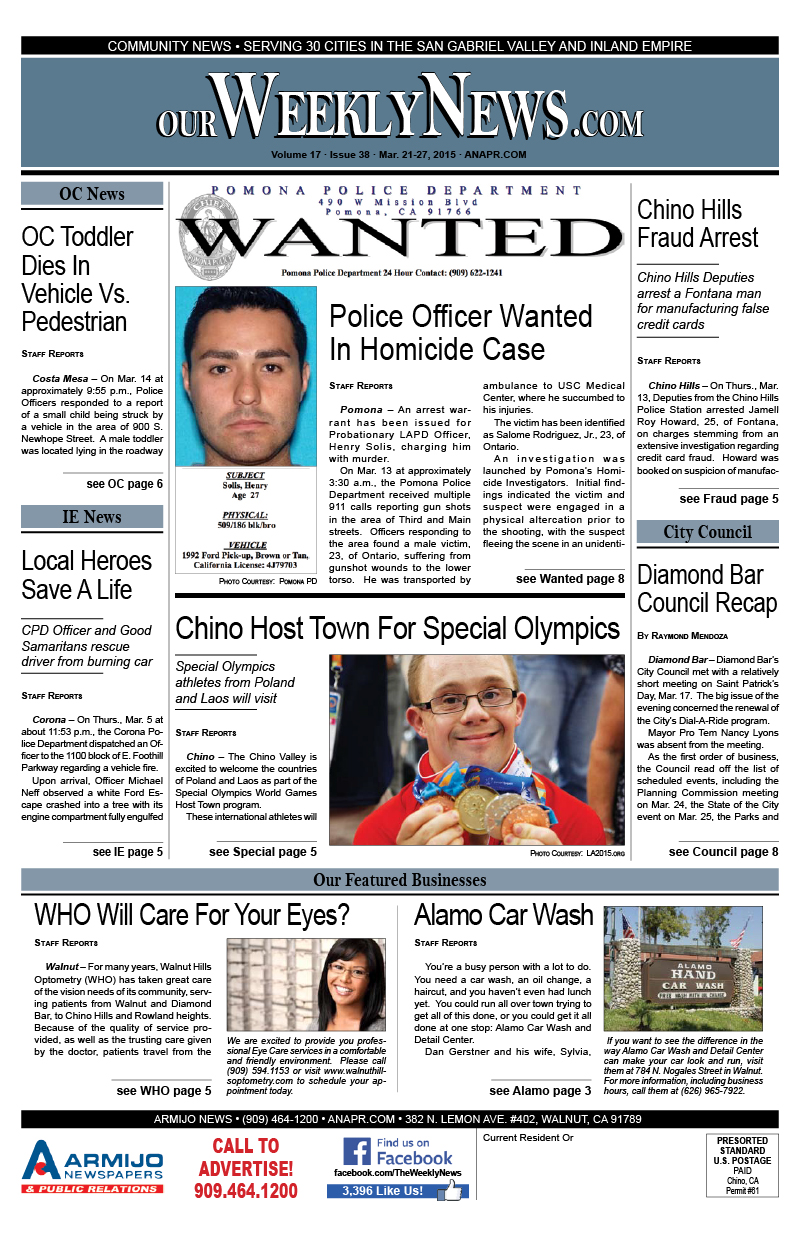 The Weekly News covers community news for Diamond Bar, Walnut, Chino Hills, Rowland Heights and surrounding areas of San Gabriel Valley and the Inland Empire. Click this link to access the complete issue in PDF format: 2015-Mar21-Weekly-WEB