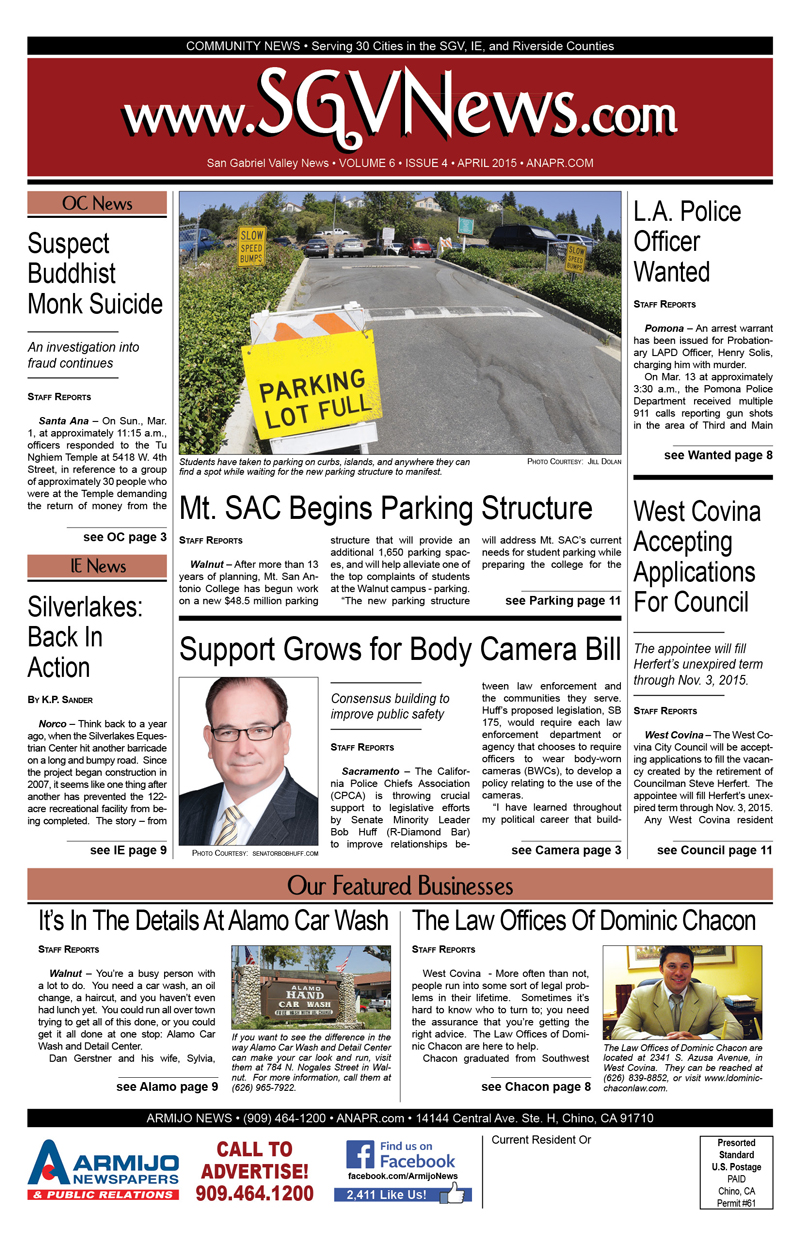 SGV News covers Diamond Bar, Walnut, La Puente, Rowland Heights and surrounding areas of the San Gabriel Valley; portions of the western Inland Empire; and northern Orange County. Click this link to access the complete issue in PDF format: 2015-04-SGVNews-WEB