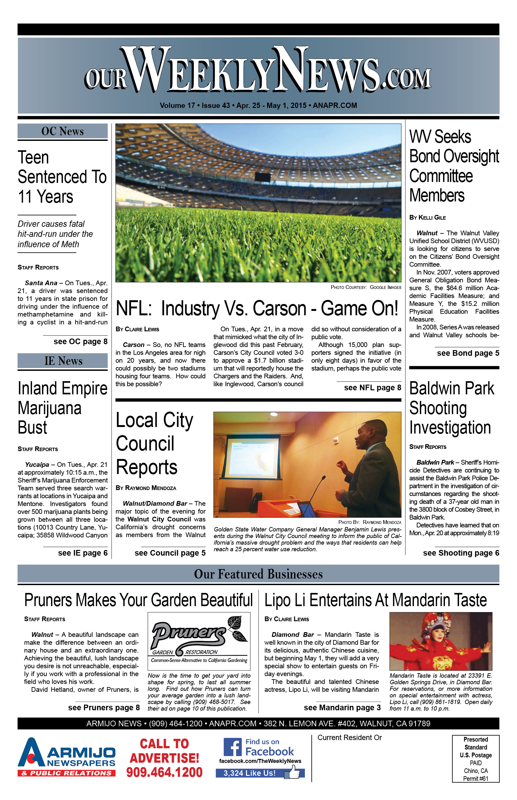 The Weekly News covers community news for Diamond Bar, Walnut, Chino Hills, Rowland Heights and surrounding areas of San Gabriel Valley and the Inland Empire. Click this link to access the complete issue in PDF format: 2015-Apr25-Weekly-WEB