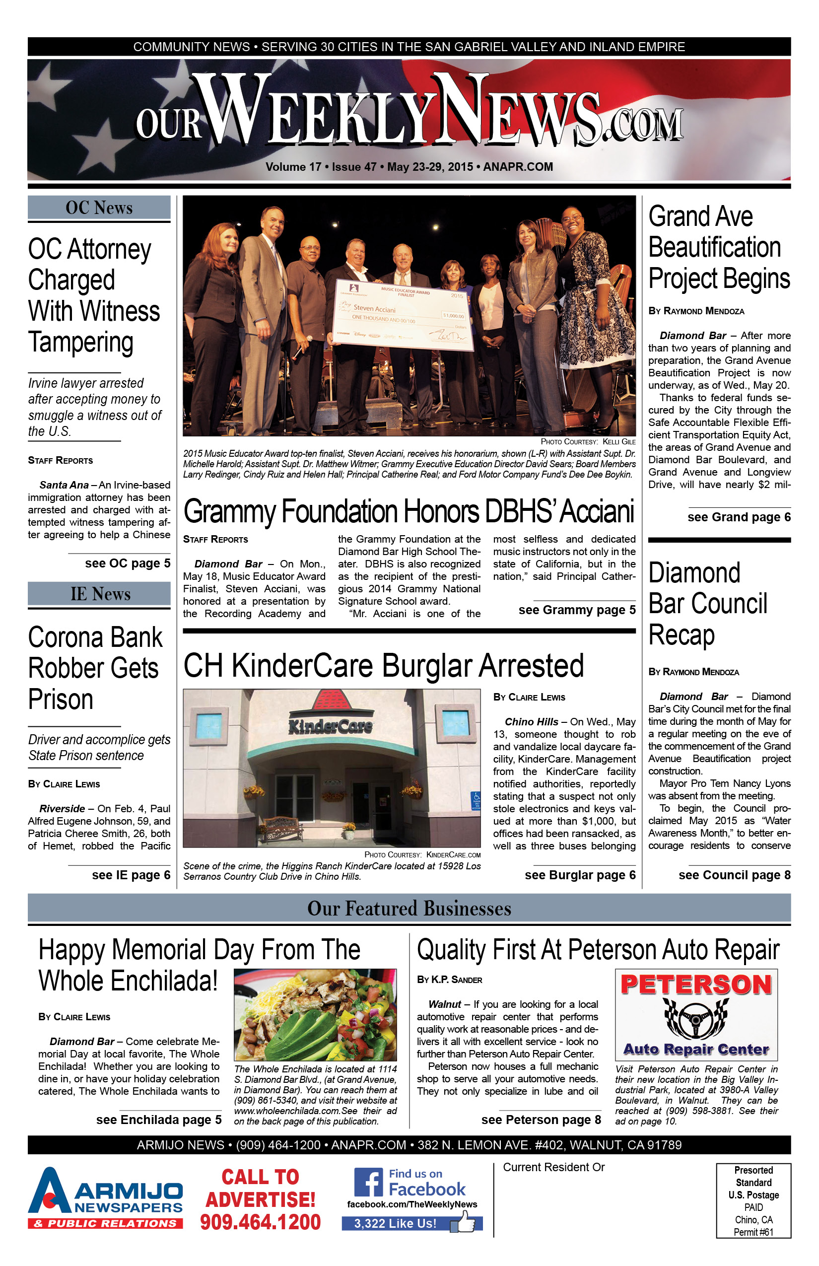 The Weekly News covers community news for Diamond Bar, Walnut, Chino Hills, Rowland Heights and surrounding areas of San Gabriel Valley and the Inland Empire. Click this link to access the complete issue in PDF format: 2015-May23-Weekly-WEB
