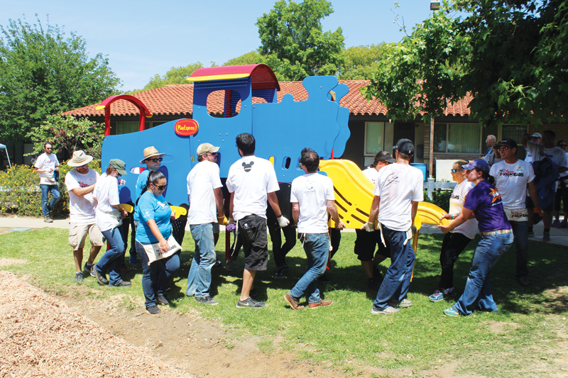 Volunteers move a newly assembled piece of playground equipment onto David & Margaret Youth and Family Services’ new playground. The playground and related structures were organized by KaBOOM!!, funded by The Walt Disney Company, and constructed by volunteers from David & Margaret, The Walt Disney Company, Club Penguin, and the La Verne community on May 28.