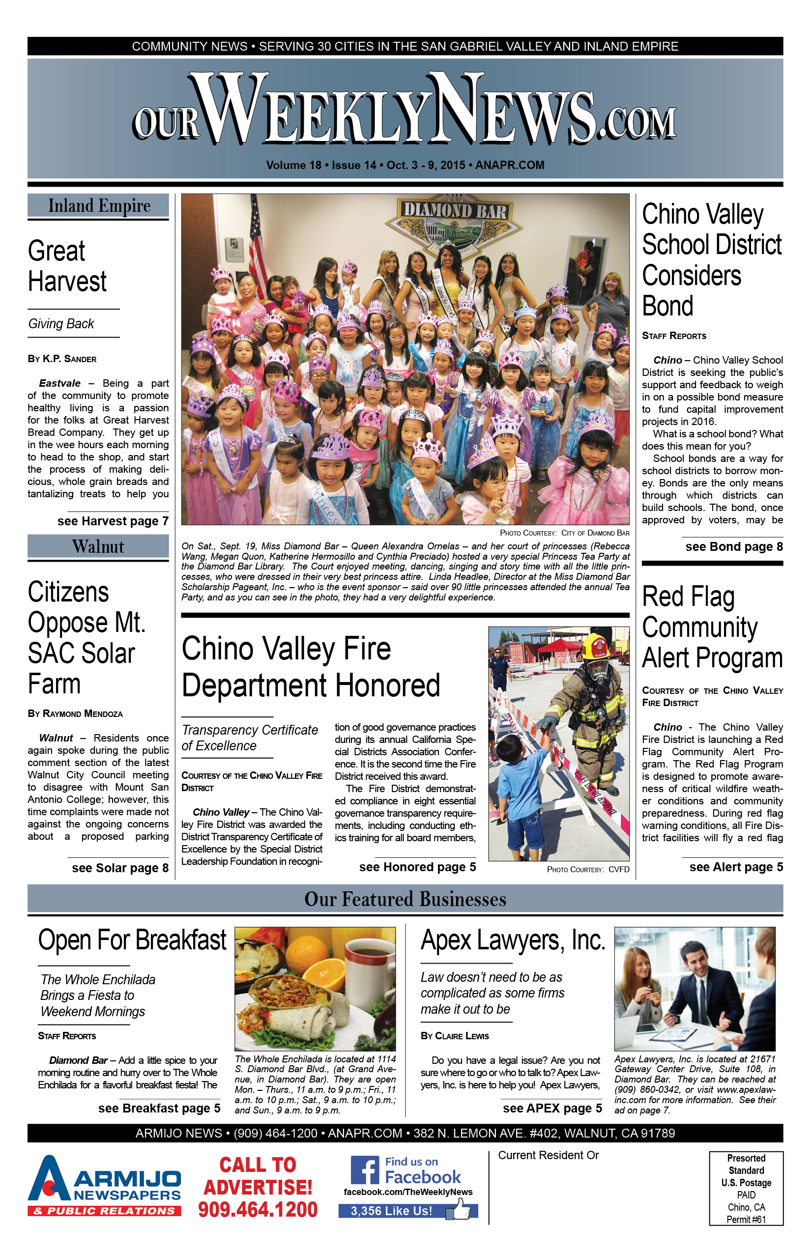 The Weekly News covers community news for Diamond Bar, Walnut, Chino Hills, Rowland Heights and surrounding areas of San Gabriel Valley and the Inland Empire. Click this link to access the complete issue in PDF format:2015-Oct03-Weekly-WEB