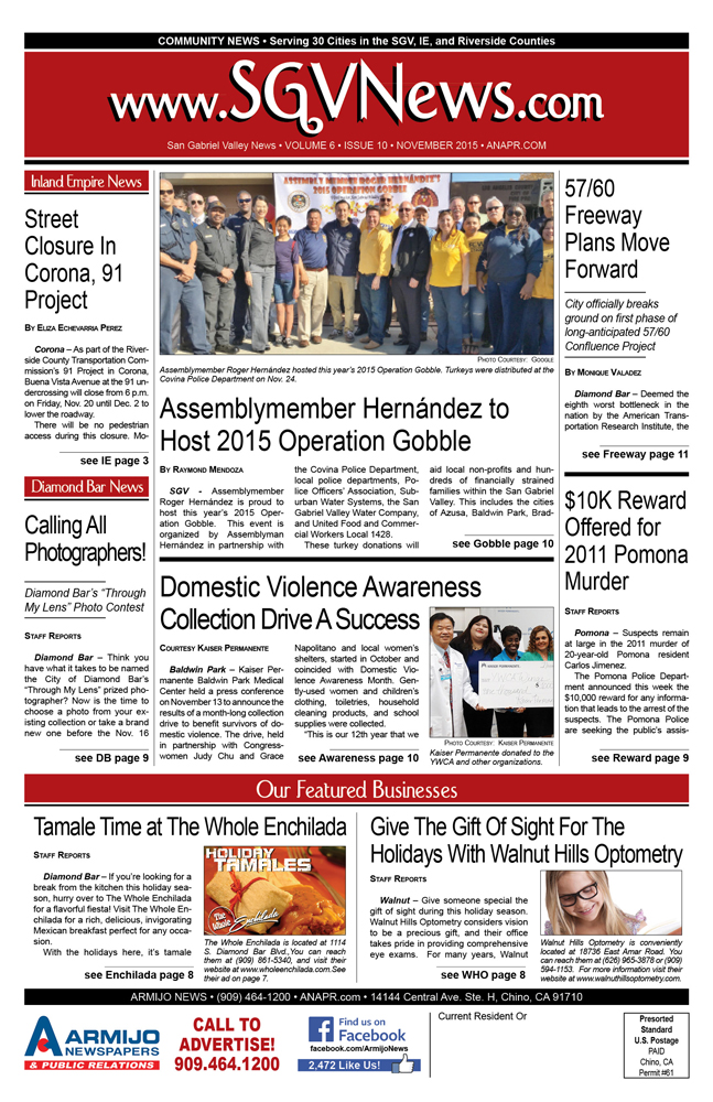 SGV News covers Diamond Bar, Walnut, La Puente, Rowland Heights and surrounding areas of the San Gabriel Valley; portions of the western Inland Empire; and northern Orange County. Click this link to access the complete issue in PDF format:November 2015 SGV Newspaper