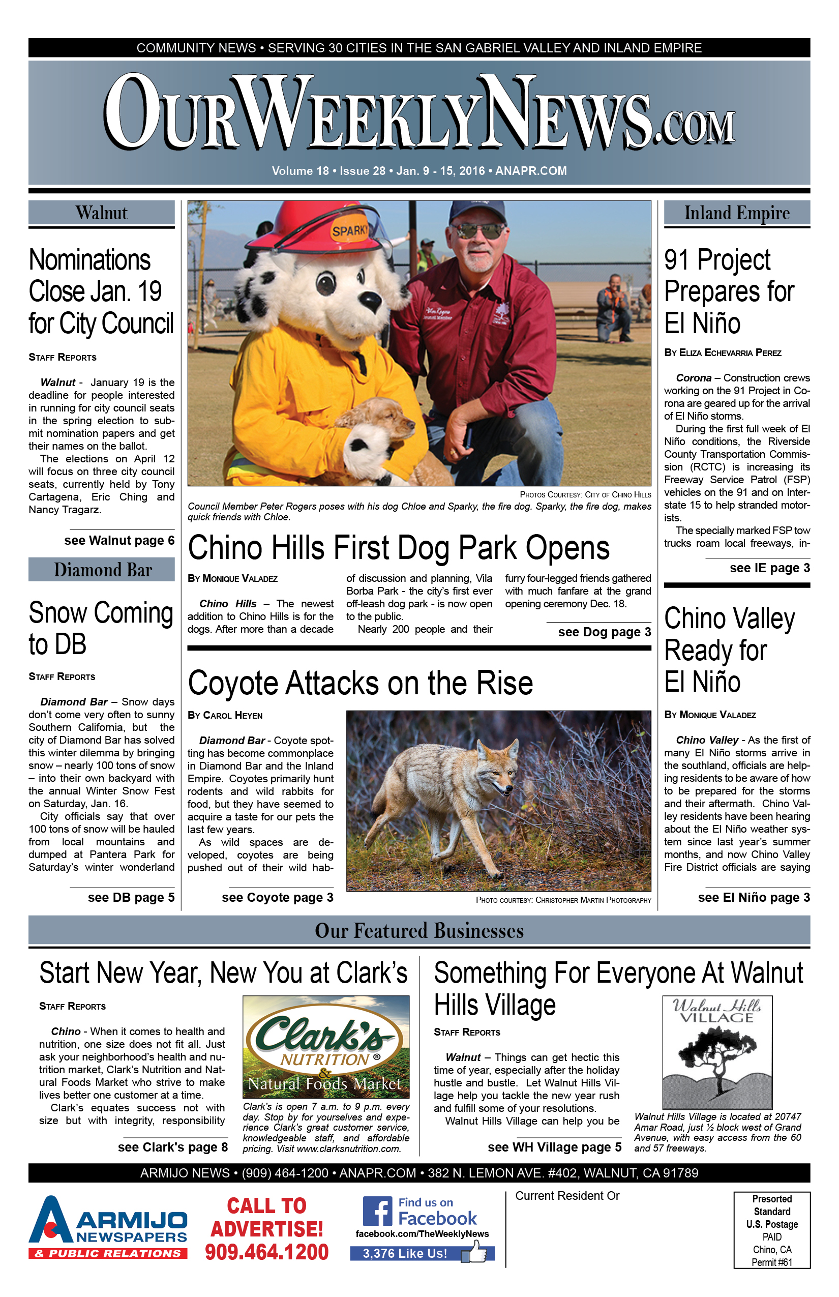 The Weekly News covers community news for Chino, Chino Hills, Diamond Bar, Walnut, Rowland Heights and surrounding areas of San Gabriel Valley and the Inland Empire. Click this link to access the complete issue in PDF format:2016-Jan9-Weekly-WEB