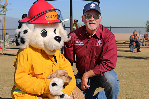 Council Member Peter Rogers poses with his dog Chloe and Sparky, the fire dog, makes quick friends with Chloe.