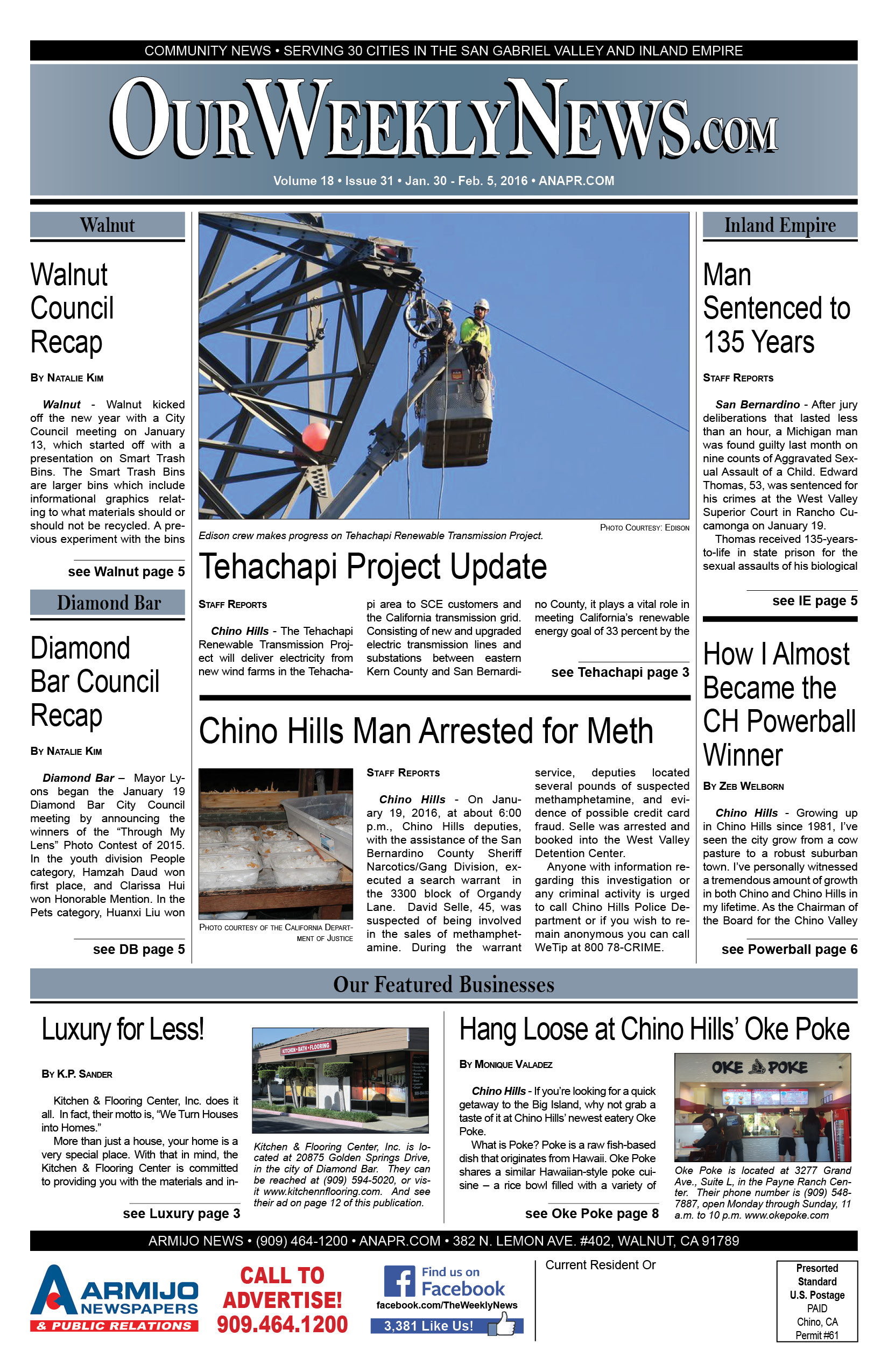 The Weekly News covers community news for Chino, Chino Hills, Diamond Bar, Walnut, Rowland Heights and surrounding areas of San Gabriel Valley and the Inland Empire. Click this link to access the complete issue in PDF format:2016-Jan30-Weekly WEB
