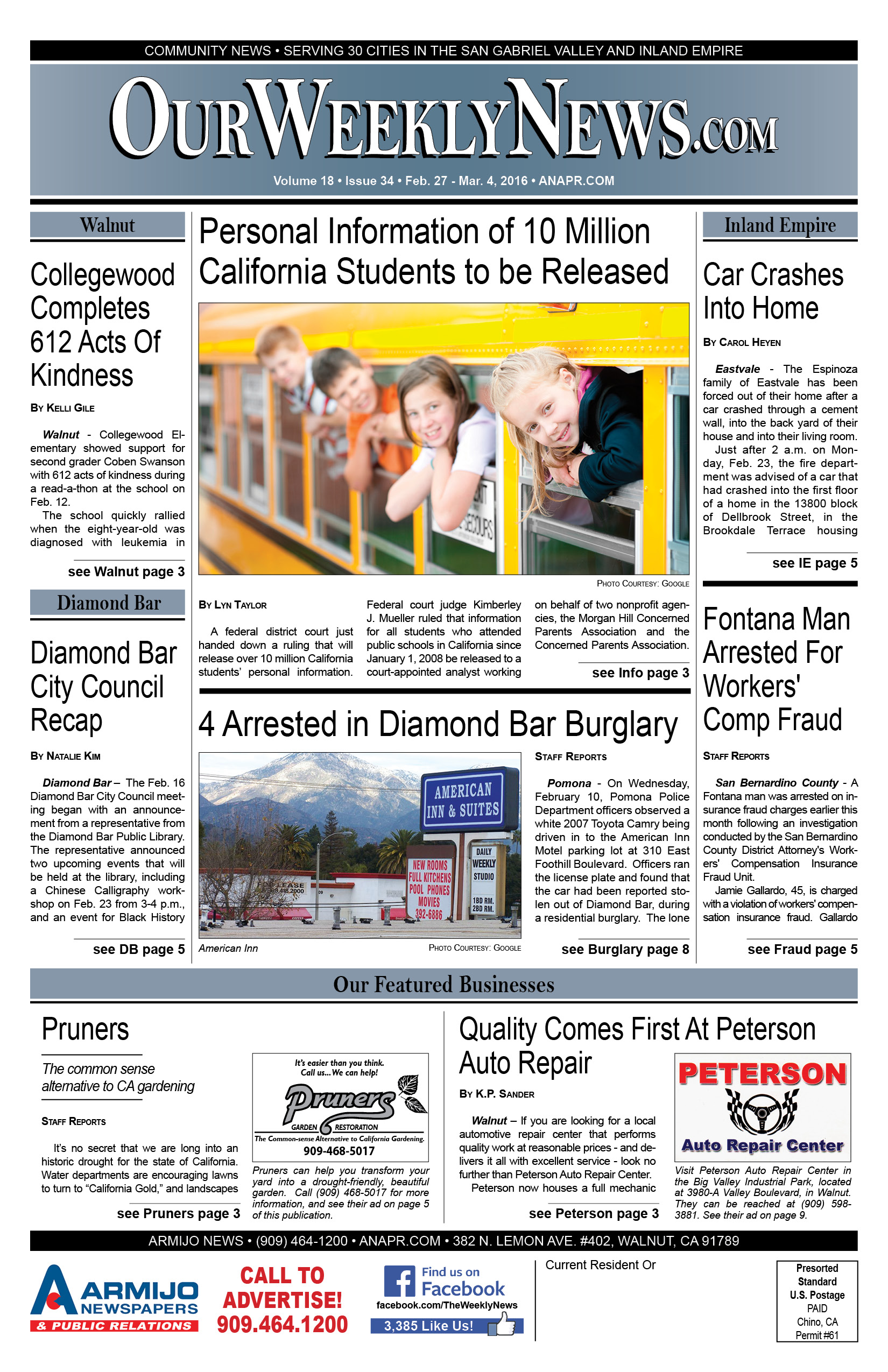 The Weekly News covers community news for Chino, Chino Hills, Diamond Bar, Walnut, Rowland Heights and surrounding areas of San Gabriel Valley and the Inland Empire. Click this link to access the complete issue in PDF format:2016-Feb27-Weekly-WEB