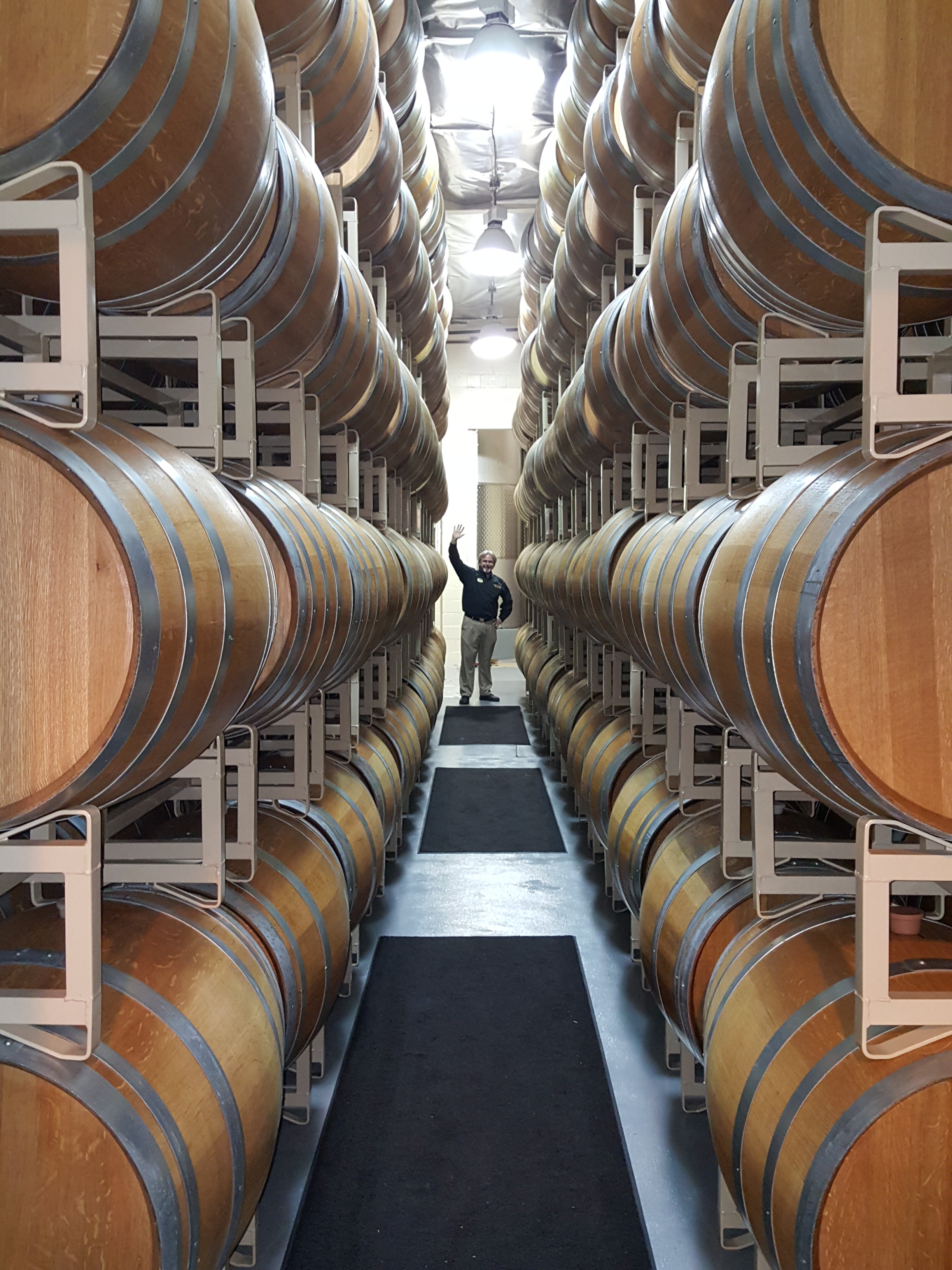Dominic Menton, Operations Manager, between rows of wine barrels at the San Antonio Winery in L.A.