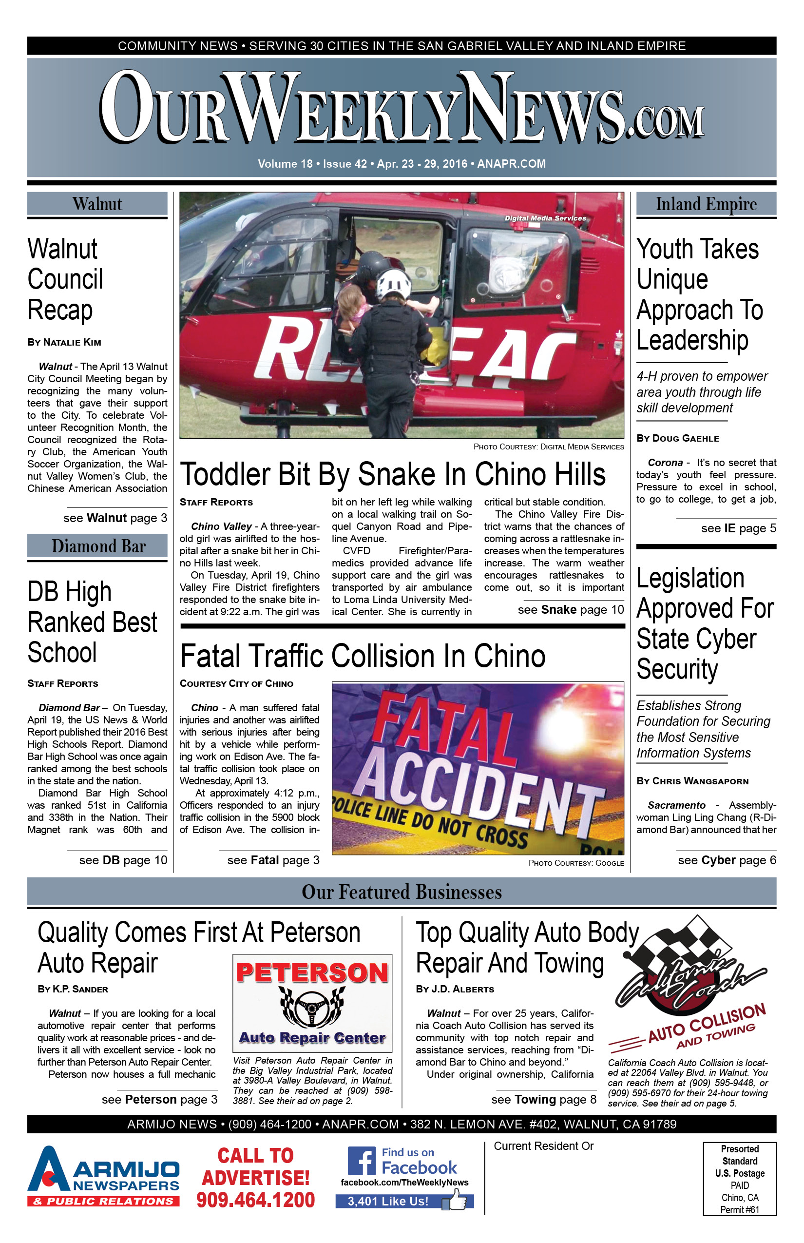 The Weekly News covers community news for Chino, Chino Hills, Diamond Bar, Walnut, Rowland Heights and surrounding areas of San Gabriel Valley and the Inland Empire. Click this link to access the complete issue in PDF format: 2016-Apr23-Weekly-WEB