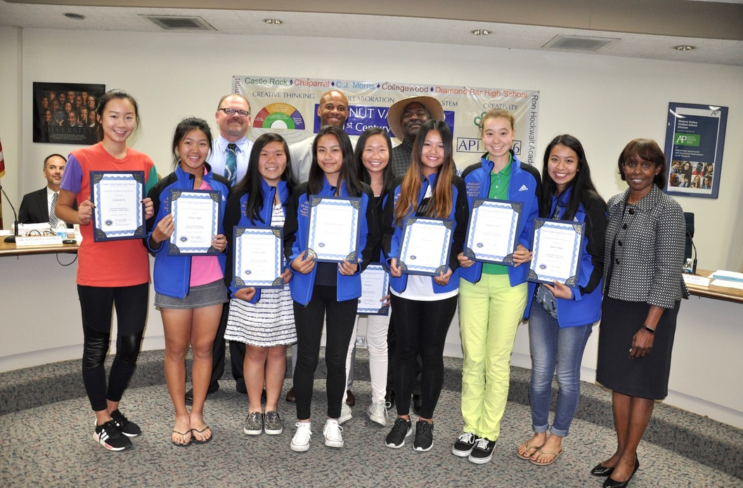 Walnut HS Girls Golf was honored as CIF Champions by the WVUSD Board of Trustees. Shown: Alison Chang, Abigail Wiranatha, Annabelle Chang, Trussy Li, Katherine Muzi, Keisha Lugito, Preciious Saelee, Catherine Yu, and Micelle Xi with coach Cecil Woods, Principal Brandon Dade, Athletic Director Jerry Person, and Board President Helen Hall.