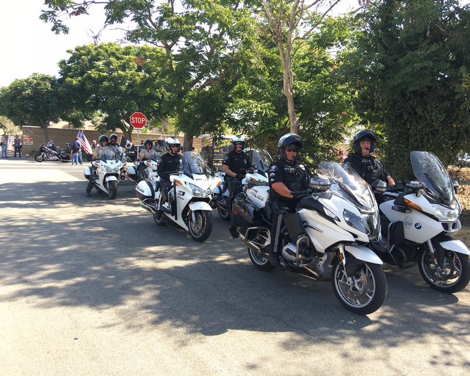 Officers and local veterans from the Chino Police Department escorted the Memorial Wall to Ruben S. Ayala Park. The Chino Police Department proceeded south on Tenth Street, west on Riverside Drive, south on Central Avenue, east on College Park Avenue, and left into the second parking lot on the left side of the street.