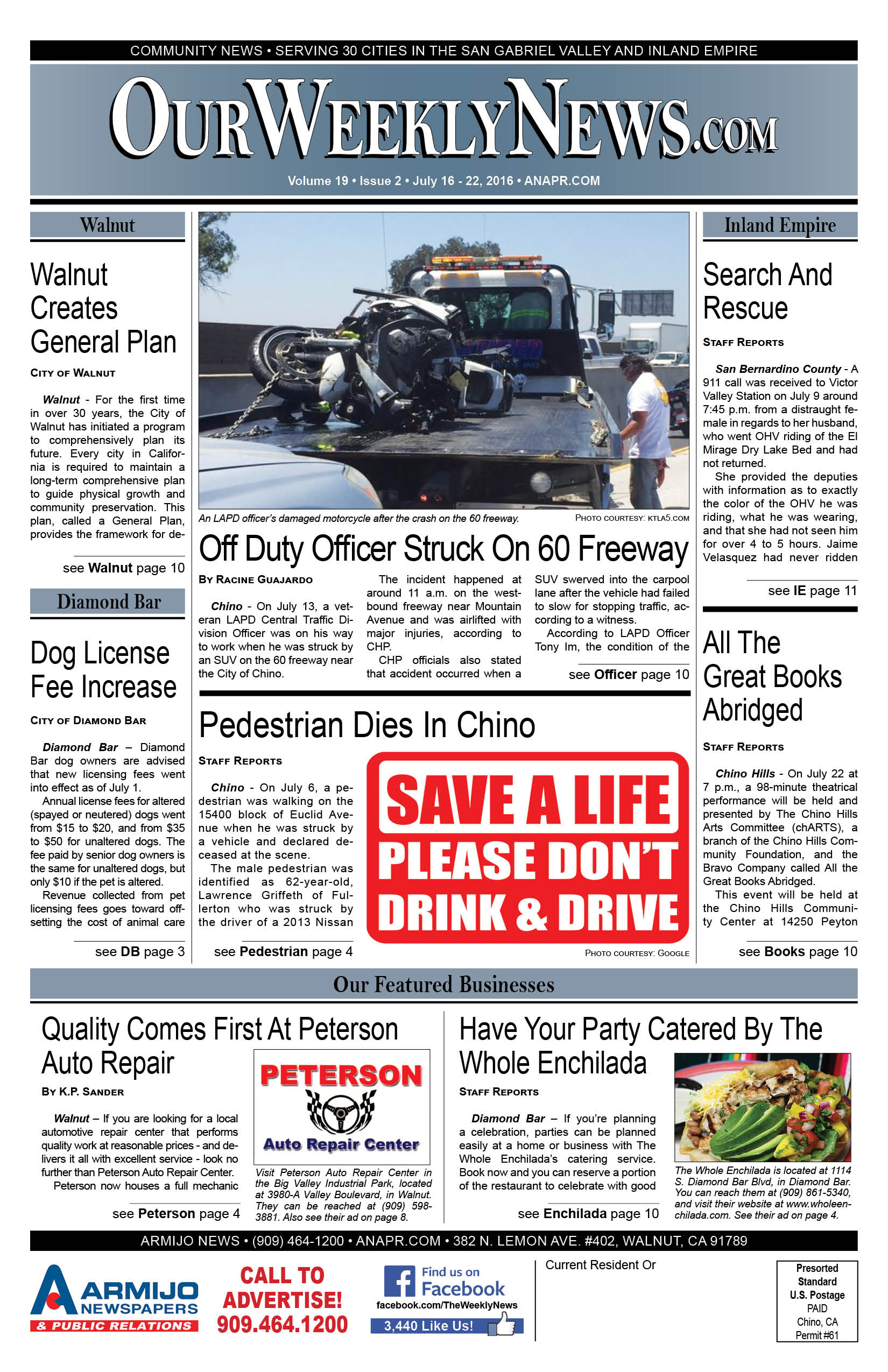 The Weekly News covers community news for Chino, Chino Hills, Diamond Bar, Walnut, Rowland Heights and surrounding areas of San Gabriel Valley and the Inland Empire. Click this link to access the complete issue in PDF format:2016-Jul16-Weekly-WEB