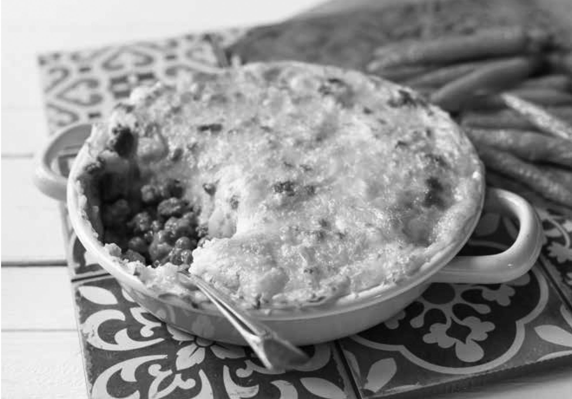 - Make sauce and mash potatoes. Sprinkle flour over onions and stir 1 minute. Add stock concentrate, ½ cup water, and peas. Stir until sauce thickens, 2-3 minutes. Add beef and stir to combine. Use a fork or potato masher to mash potatoes with ¼ cup milk and 1 TBSP butter until smooth. Season with salt and pepper.