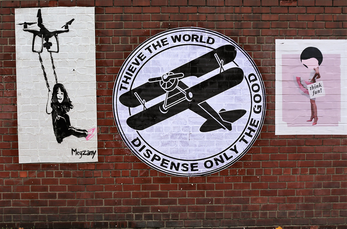 Children are taught graffiti is vandalism. The beauties of graffiti and the possibility for it to be an encouraging tool is washed out by its more common occurrences of destruction. Exploring new places, specifically the urban scene, awakens people to the power of street art. When they’re taking a morning commute every day on the bus in downtown LA, staring listlessly outside the window, bored and unexcited about heading to work. The urban landscape seems barren at times, when the stores are closed and gated, and people are tucked away in their job offices or home nooks. However, in this monochromatic scene with dull paint chipping away at the curbs, cars parked on the street and in between, there is a painted box on the corner of somewhere and 6th street. There is a white face on the side with sunglasses on, and when the bus stops at a red light just close enough, the rider can read: “Thieve the world; dispense only the good,” signed by Megzany.