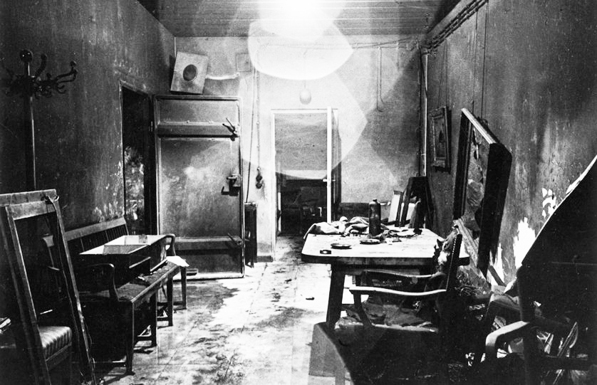 A new view of a photograph that appeared, heavily cropped, in LIFE, picturing Hitler’s bunker, partially burned by retreating German troops and stripped of valuables by invading Russians.