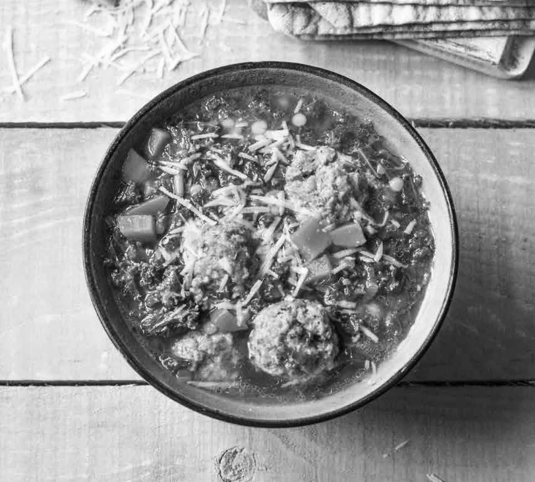 - Finish soup. Stir couscous into soup, then carefully drop in meatballs. Return to a simmer and cook until meatballs are no longer pink on outside, about 3 minutes. Add half the kale from the package (use the rest as you like). Cook until leaves are tender and couscous is al dente, about 4 minutes. Season to taste with salt and pepper.