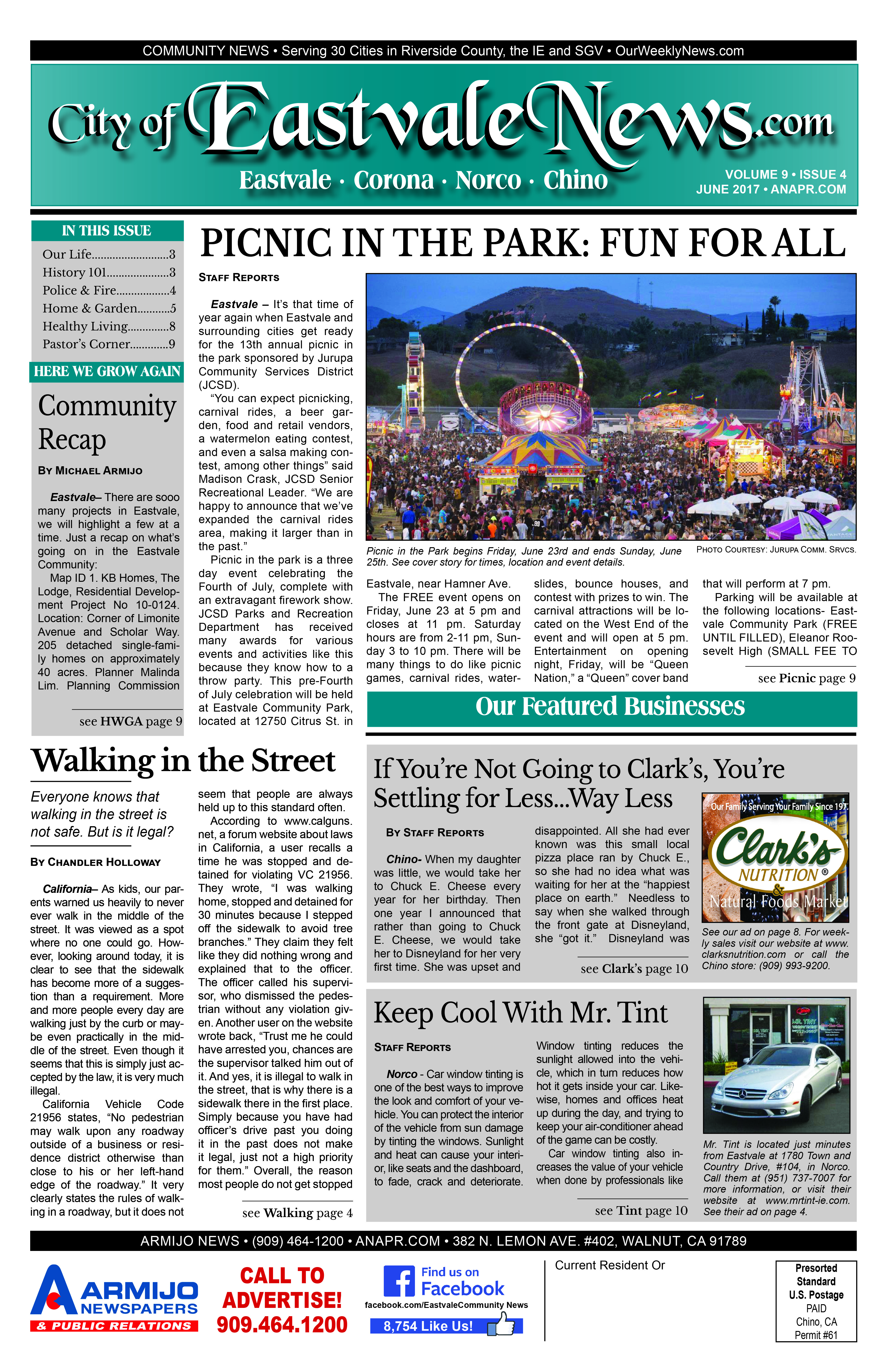 The Eastvale Community News covers local news for Eastvale, Norco, Corona, and Chino. Click the following link to access the complete issue in pdf format: 2017-06EastvaleNews