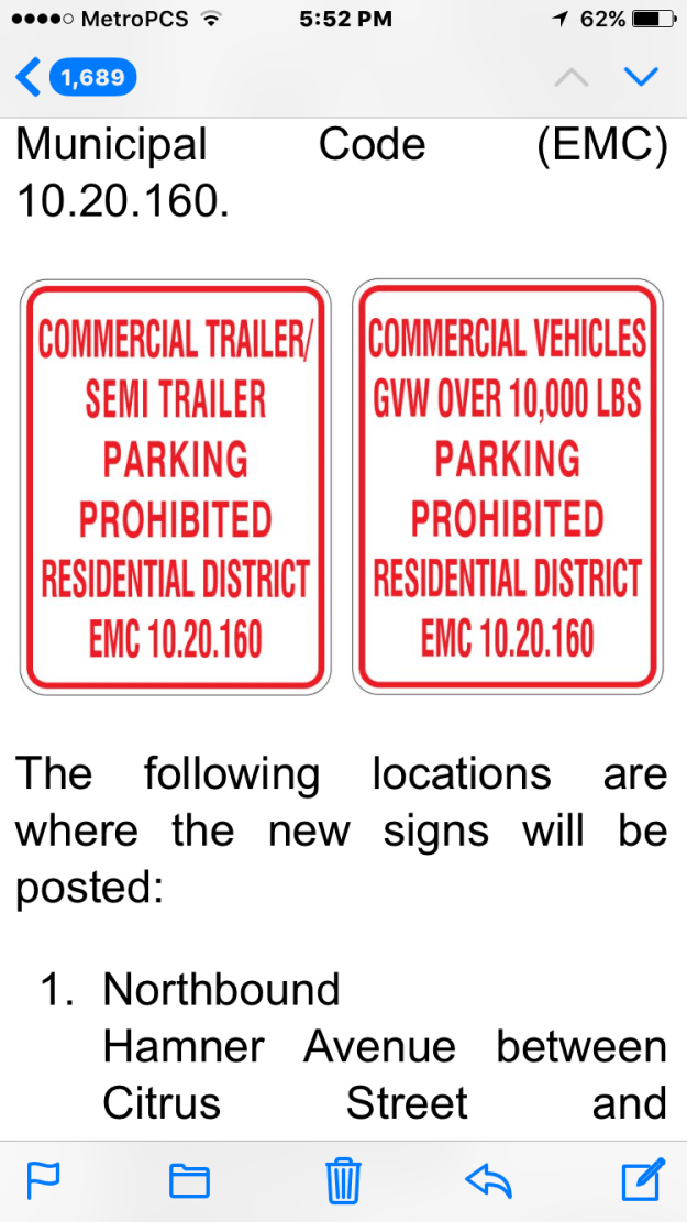 The City of Eastvale will be installing 18 new signs at 9 different locations throughout Eastvale to prohibit “Commercial Trailer/Semi Trailer