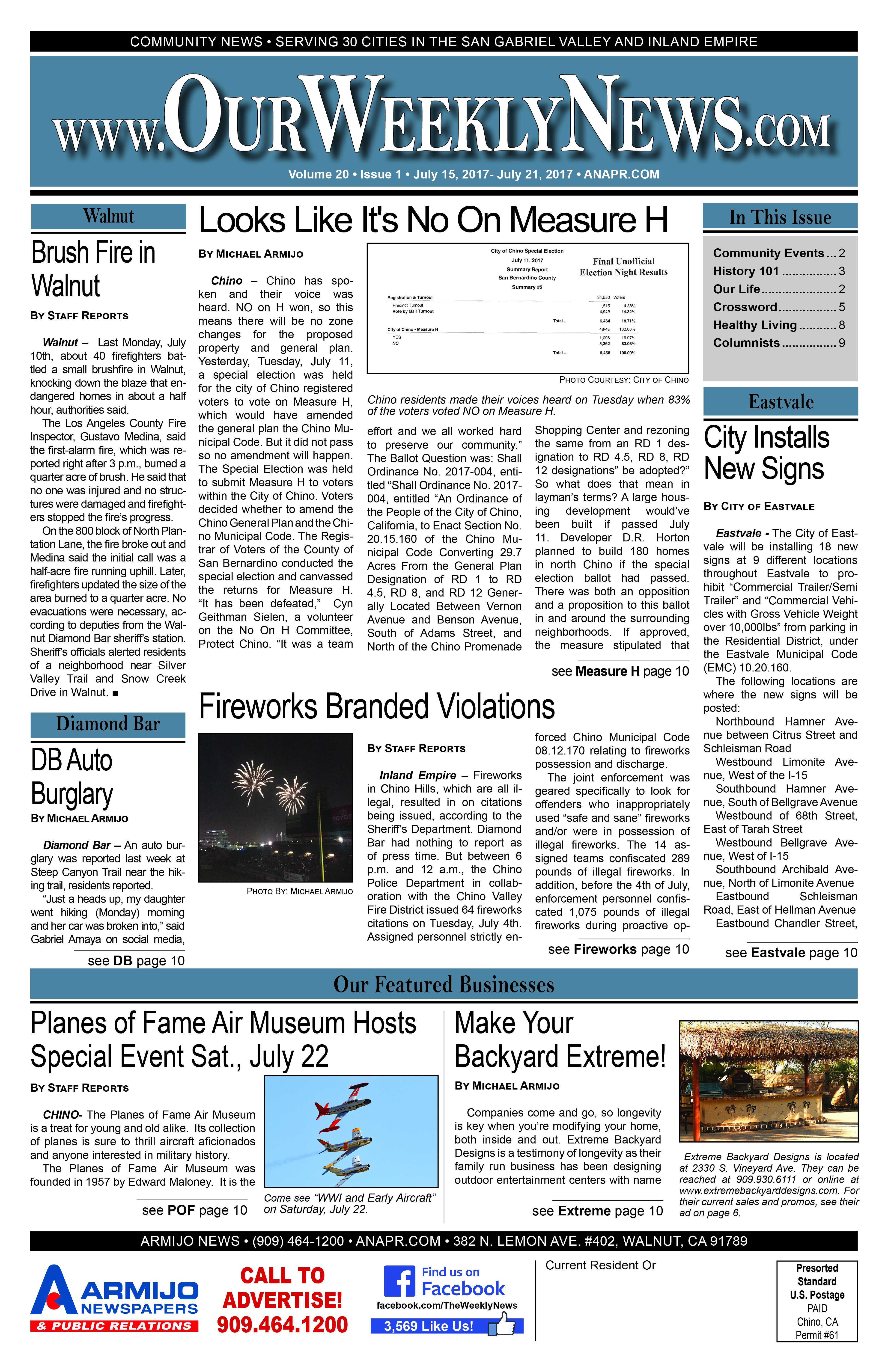 The Weekly News covers community news for Chino, Chino Hills, Diamond Bar, Walnut, Rowland Heights and surrounding areas of San Gabriel Valley and the Inland Empire.Click this link to access the complete issue in PDF format: OurWeekly.2017-07-15