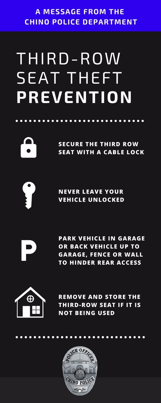 Our local PD has received several reports of third-row seat thefts. GM model SUV’s, including the Suburban, Tahoe, Yukon and Cadillac Escalades are primarily being targeted. The thefts are most commonly occurring in residential areas during the night.Please safeguard your vehicle by using the prevention tips provided and report any suspicious activity to Chino PD at (909) 628-1234.