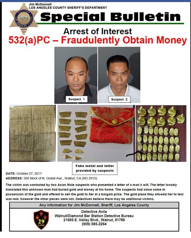 Fake Gold Scam The victim was contacted by two Asian Male suspects selling fake gold. http://bit.ly/2yBZYZe