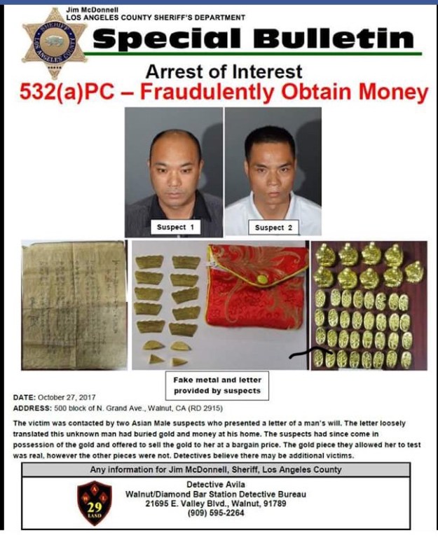 The victim was contacted by two Asian Male suspects who presented a letter of a man’s will. The letter loosely translated this unknown man had buried gold and money at his home.