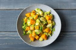 6  Toss roasted squash and Brussels sprouts into pan with sauce. Gently stir in gnocchi, then season with salt and pepper. Divide between bowls and serve.