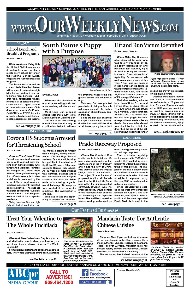 The Weekly News covers community news for Chino, Chino Hills, Diamond Bar, Walnut, Rowland Heights and surrounding areas of San Gabriel Valley and the Inland Empire.Click this link to access the complete issue in PDF format: