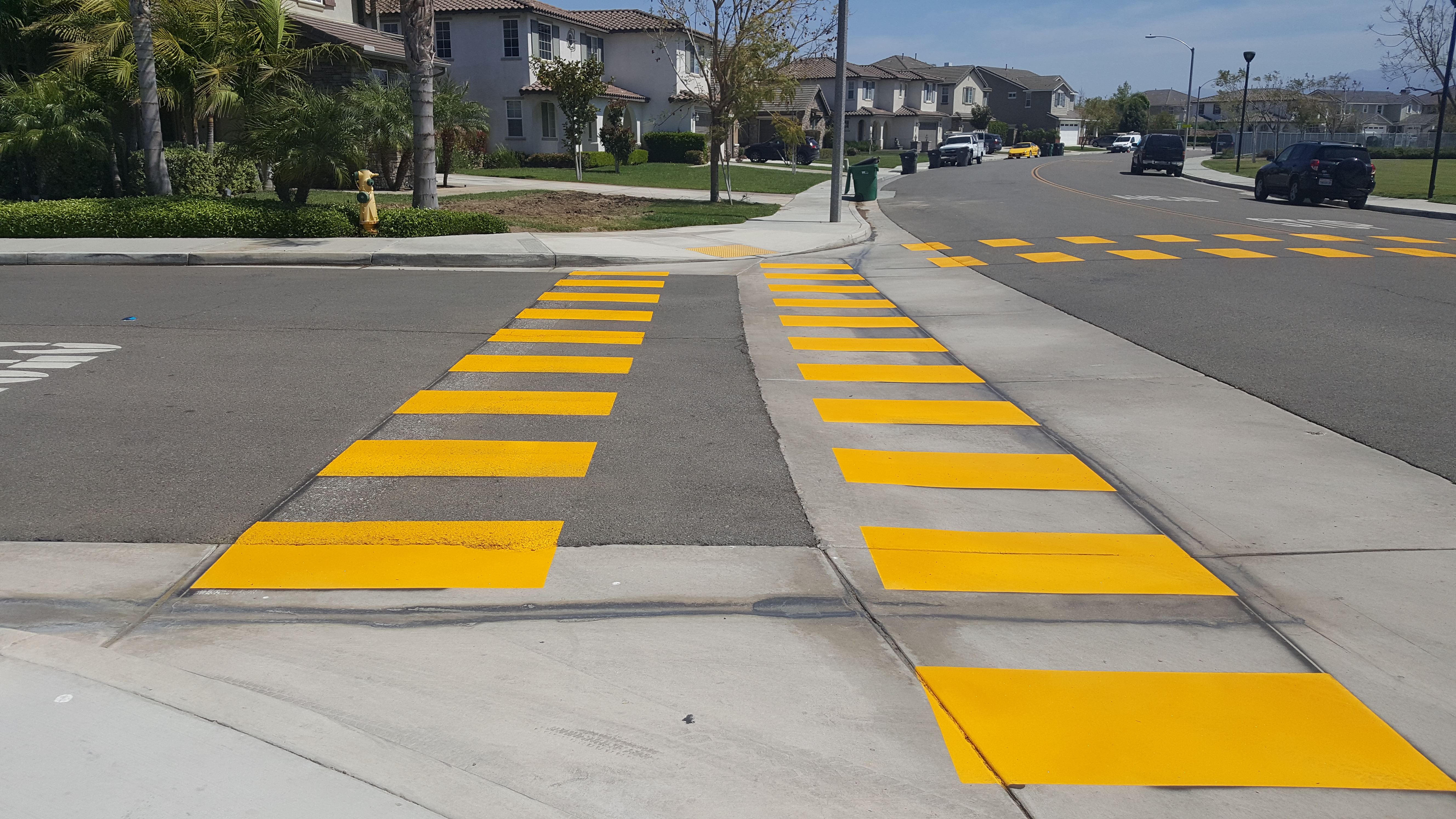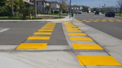 Eastvale – During a recent Neighborhood Watch meeting, an Eastvale resident presented their concerns about the intersection on Cherry Creek Circle and Sunny Brook Lane. The intersection, according to the resident is a high pedestrian traffic intersection and that it was in need of a pedestrian crosswalk. The Public Works Department took the concern to heart and a team assessed the intersection in the field by observing traffic and conducting traffic counts. It was confirmed, based on their findings, that there truly was need for the installation of a pedestrian crosswalk. Due to the number of students and parents that cross the street daily triple four style enhanced crosswalks were installed as well as a curb ramp that meets ADA requirements.