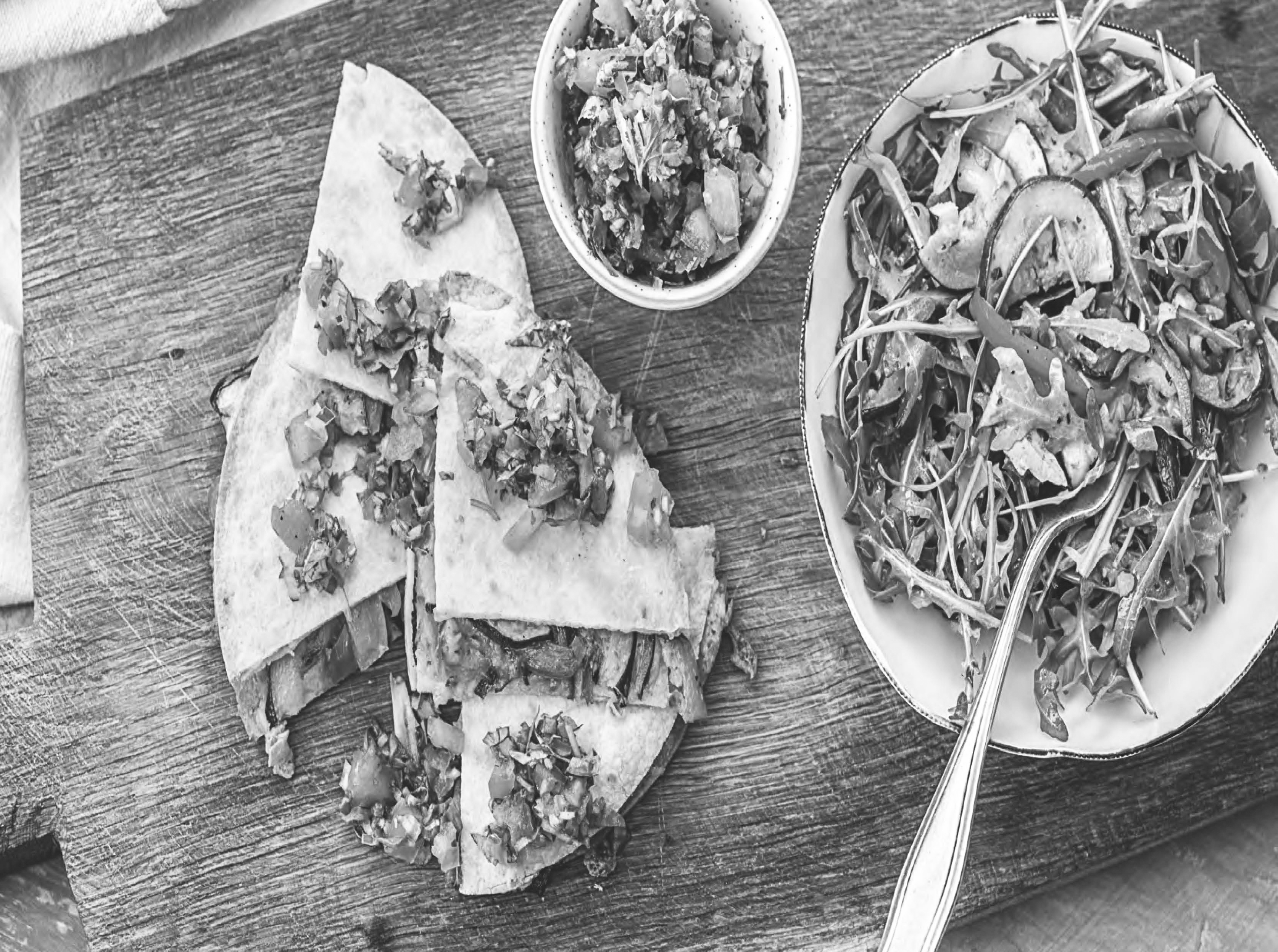 6 TOSS SALAD AND SERVE. Bake quesadillas in oven cheese melts and tortillas crisp, 6-10 minutes, flipping halfway through. Toss remaining veggies, arugula, a squeeze of lime, and a drizzle of olive oil in a large bowl. Season with salt and pepper. Cut quesadillas into wedges. Serve with pico de gallo and salad on the side.