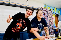 Walnut High School junior Bradley Conrad gives his teacher Kirsten Thibeault a thumbs up for a special Lego birthday gift.