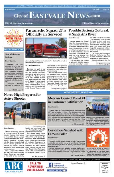 The City of Eastvale News covers local news for Eastvale, Norco, Corona, Jurupa Valley, Mira Loma, Chino and more. Click the following link to access the complete issue in pdf format: https://anapr.com/wp-content/uploads/2019/08/this.one_.2019-08-eastvalenews12pages.pdf