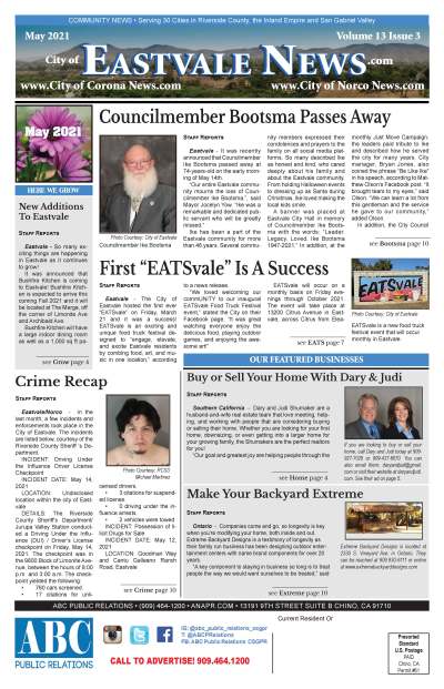 The City of Eastvale News covers local news for Eastvale, Norco, Corona, Jurupa Valley, Mira Loma, Chino, Chino Hills and more. Click the following link to access the complete issue in pdf format: