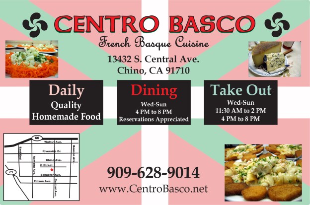 Centro Basco Restaurant is open Wednesday through Sunday and can be reached at 909.628.9014, http://www.centrobasco.net, or just stop by at 13432 S. Central Avenue, just a block south of Chino avenue in Chino.