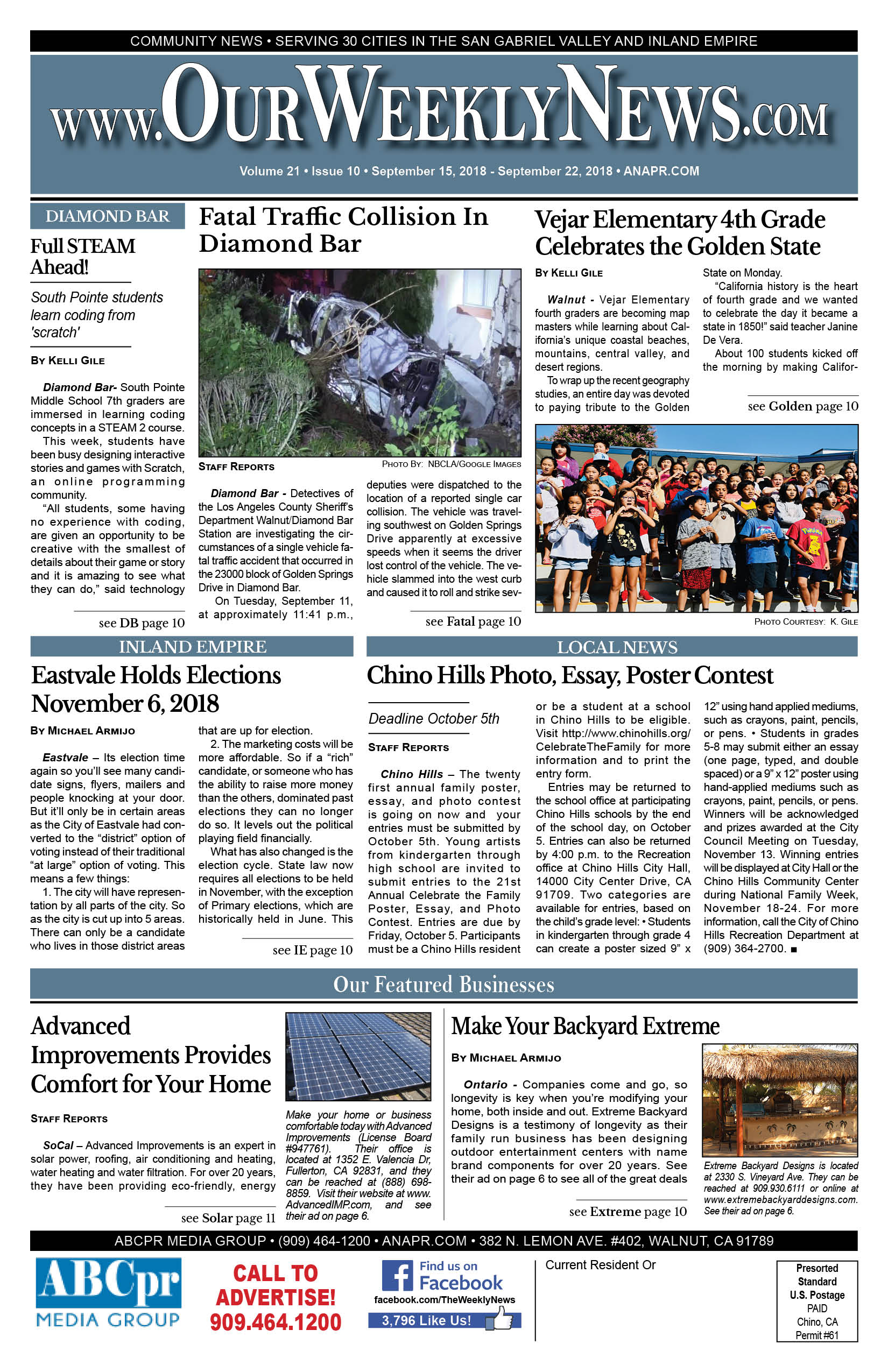 The Weekly News covers community news for Chino, Chino Hills, Diamond Bar, Walnut, Rowland Heights and surrounding areas of San Gabriel Valley and the Inland Empire.Click this link to access the complete issue in PDF format: 2018-15-09.WeeklyNews