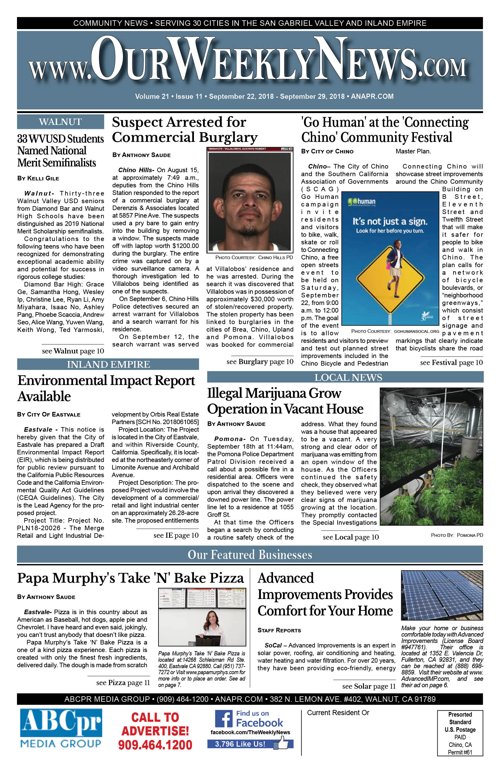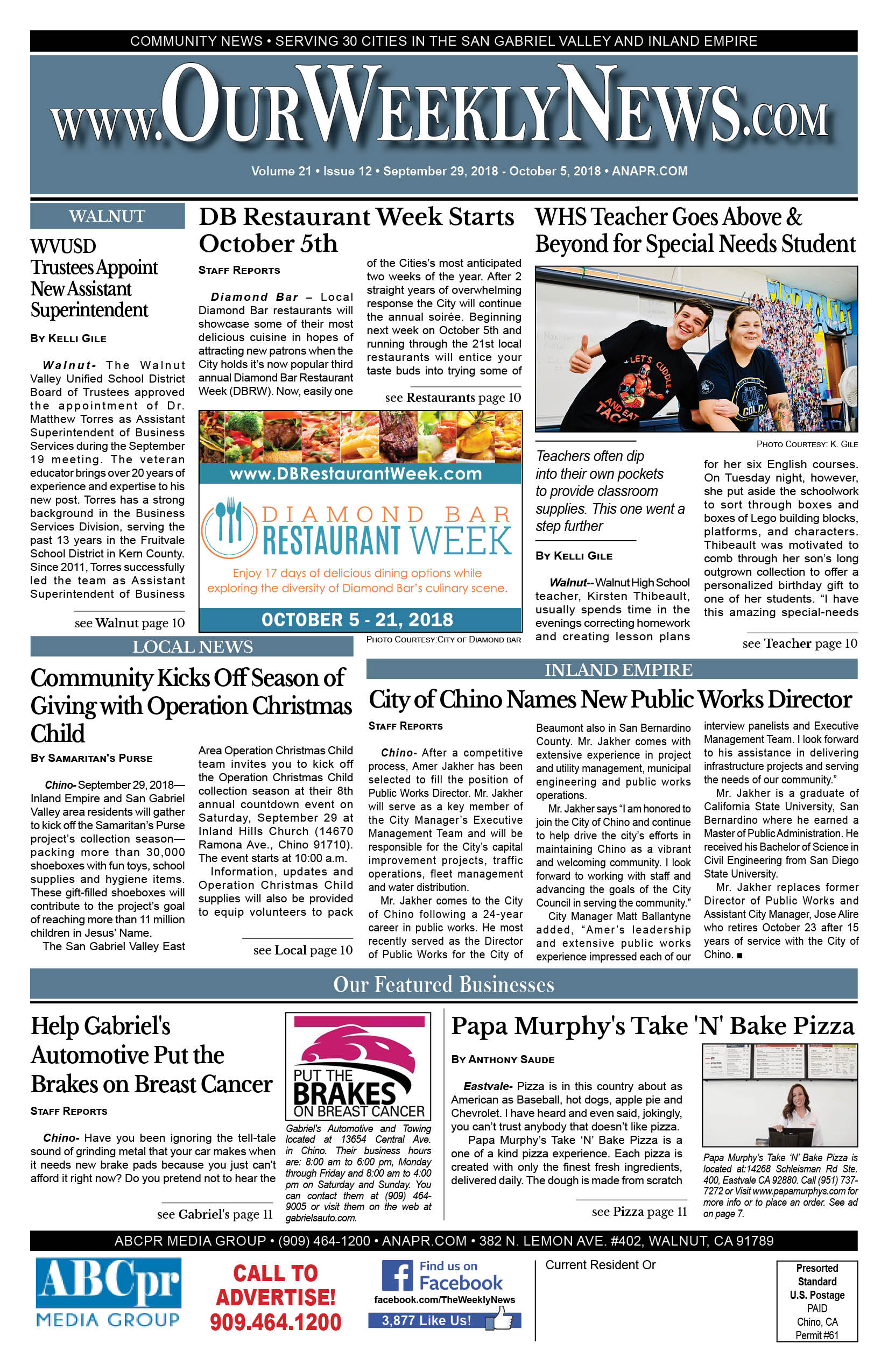 The Weekly News covers community news for Chino, Chino Hills, Diamond Bar, Walnut, Rowland Heights and surrounding areas of San Gabriel Valley and the Inland Empire.Click this link to access the complete issue in PDF format: ALL.2018-29-09.WeeklyNews