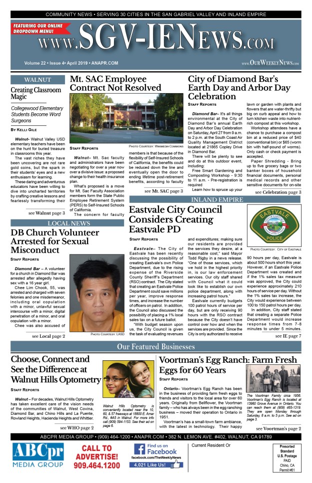 The SGV-IE News covers local news for Walnut, Diamond Bar, Chino, Chino Hills and the surrounding areas. Click the following link to access the complete issue in pdf format: https://anapr.com/wp-content/uploads/2019/05/2019-04-sgvienews.pdf