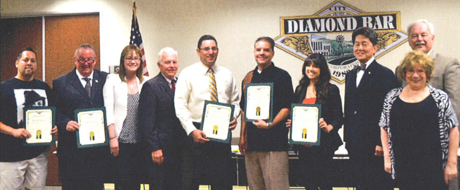 The City of Diamond Bar recognized volunteers who helped raise over $7,700 for the Walnut-Diamond Bar Sheriff’s Station. Left to right: Michael Armijo, Dickie Simmons from Supervisor Don Knabe’s office, Councilwoman Ling Chang, Mayor Pro-Tem Ron Everitt, Marcos Granada, Gil Rivera, Sarah Armijo, Mayor Jack Tanaka, Councilmembers Carol Herrera and Steve Tye.