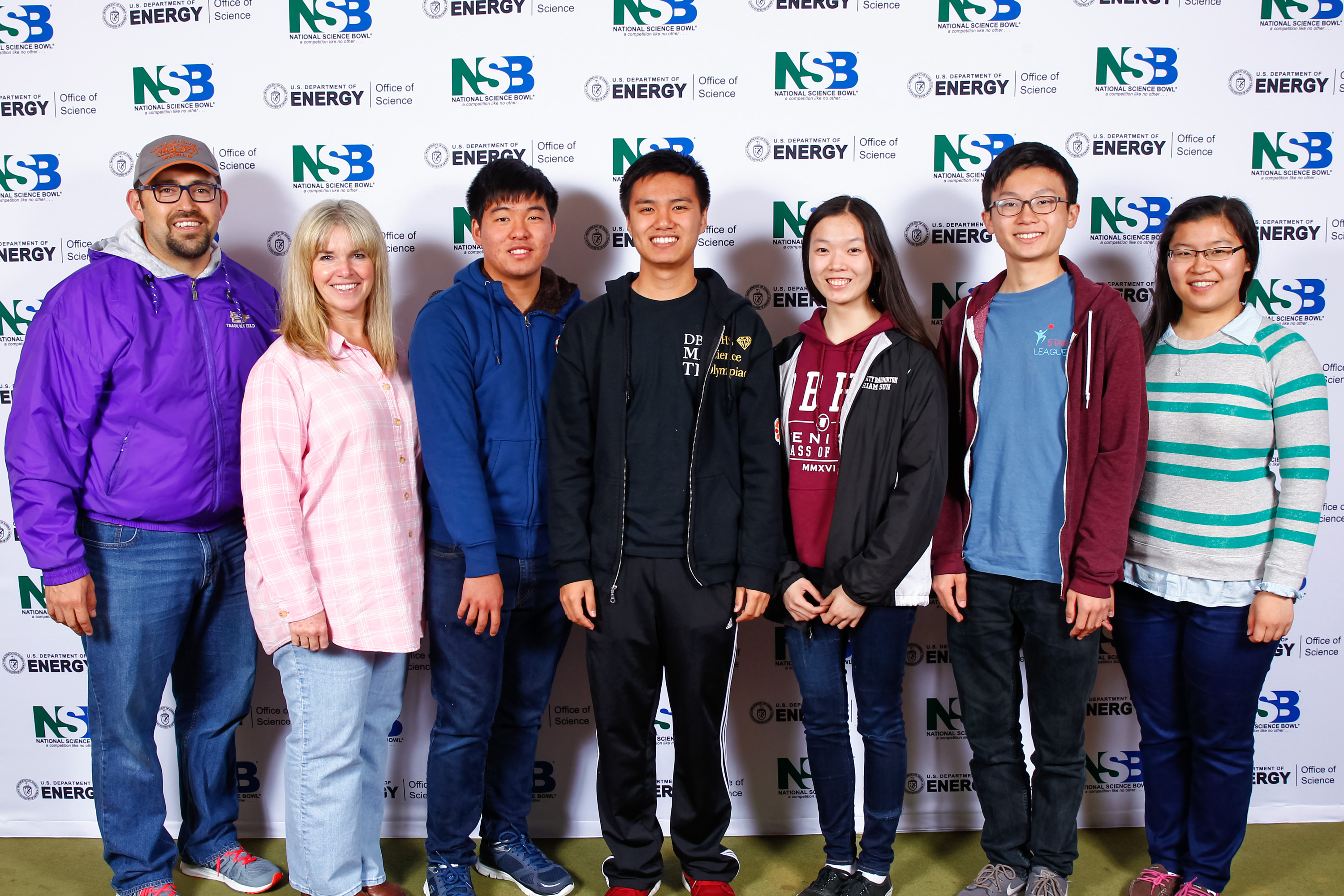 Diamond Bar High School Jose Marquez, coach, Latitia Thomas, assistant coach, Brandon Hung, Jeff Chow, Miriam Sun, Ben Chen and Leslie Sim of Diamond Bear, CA, pose for a team photo during the 2016 National Science Bowl competition, Thursday, April 28, 2016, in Washington, DC. (Photo by Jack Dempsey, U.S. Department of Energy, Office of Science)