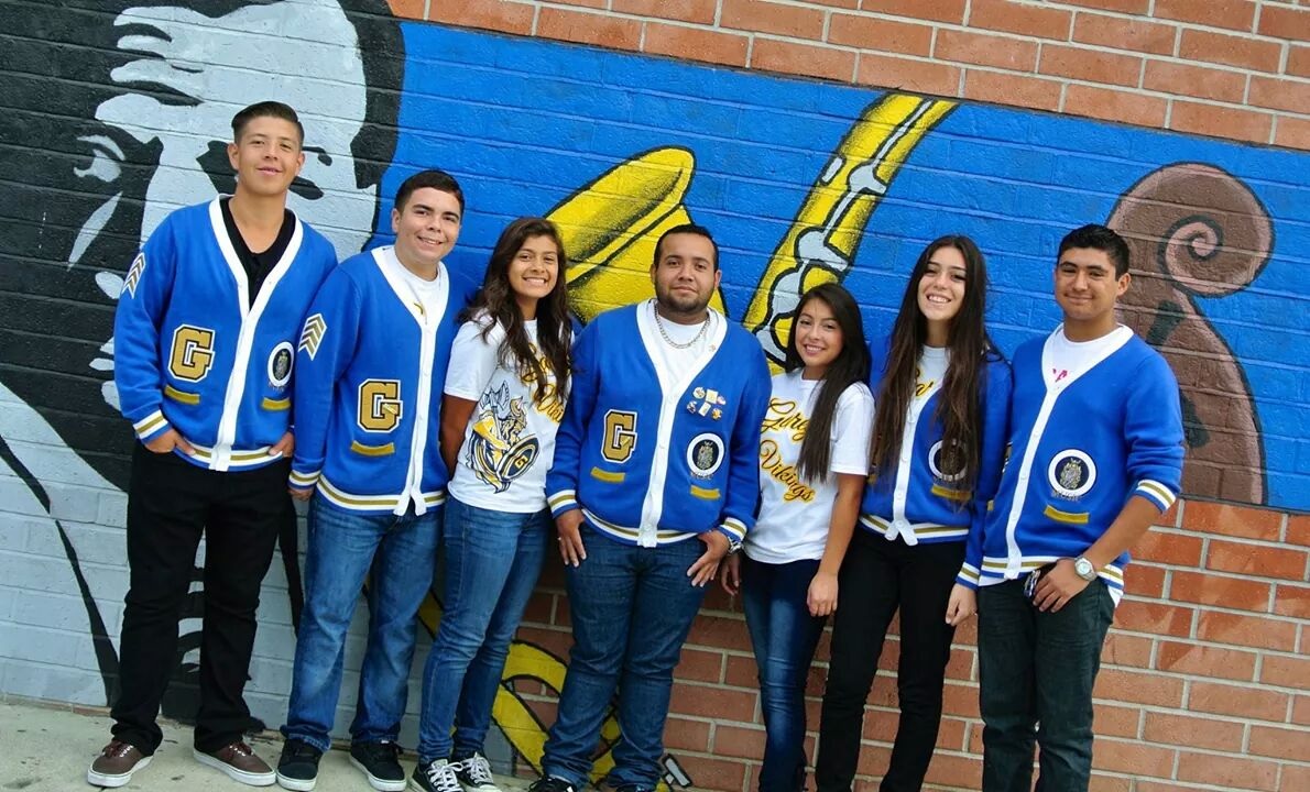 Garey High School students Miguel Saldana (snare drum), left, Armando Santana (tenor sax), Angelica Arechiga (banner), Christopher Chavez (trombone), Isabel Ibarra (banner), Mireya Munguia (clarinet) and Jose “JJ” Cachu (herald trumpet) were selected to perform in the Tournament of Roses Honor Band on New Year’s Day in Pasadena. (Photo Courtesy: Juliette Funes)