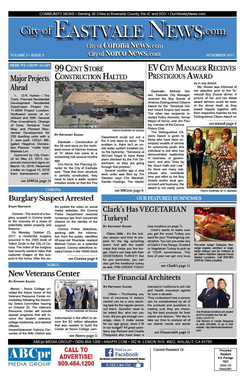 The Eastvale Community News covers local news for Eastvale, Norco, Corona, and Chino. Click the following link to access the complete issue in pdf format: ALL.EastvaleNews.11-2017
